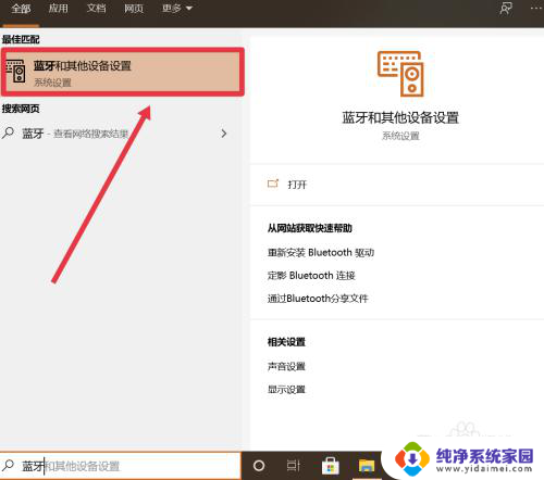 1.在电脑左下方搜索框中输入“蓝牙”进行搜索,找到并点击“蓝牙和其他设备设置”。